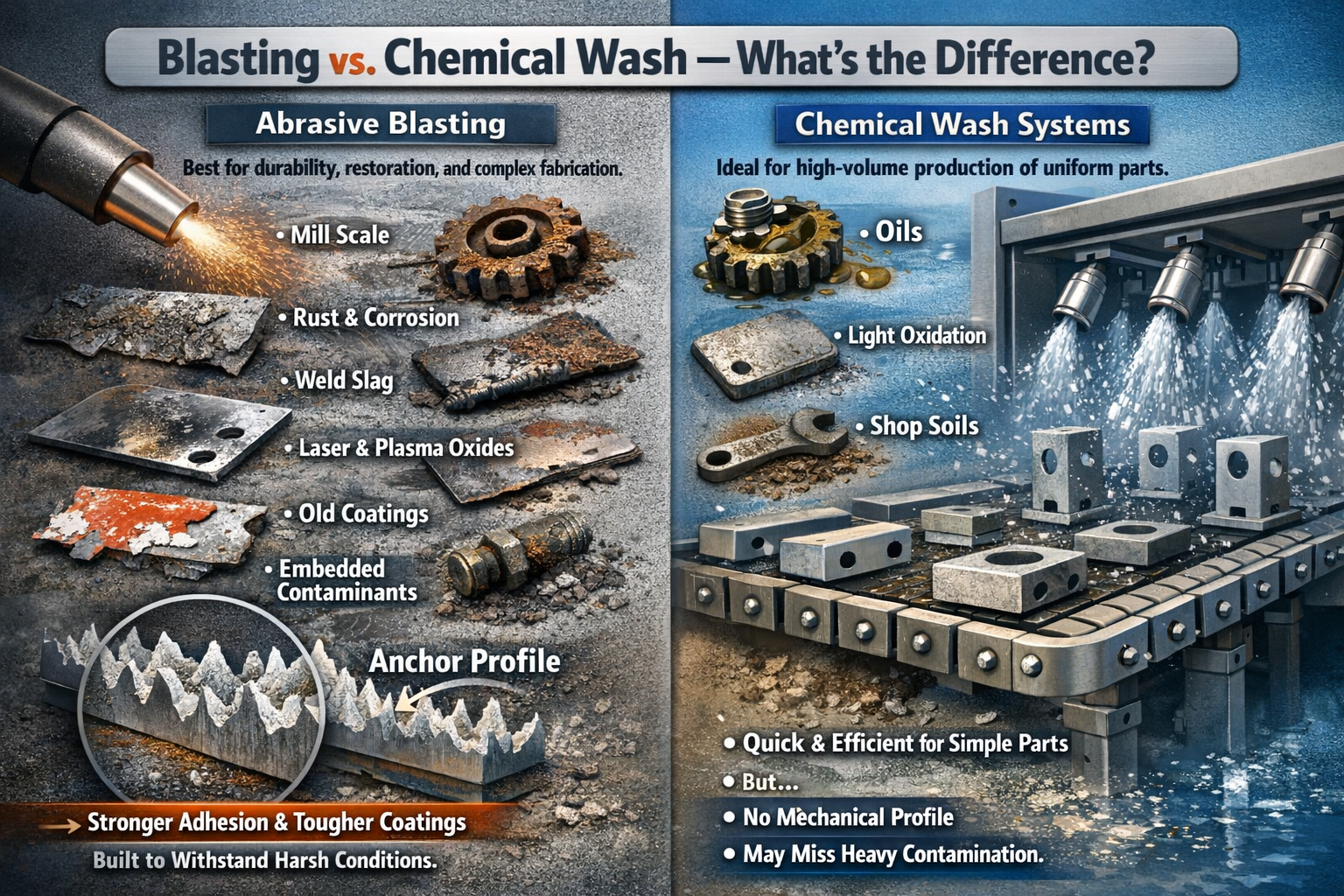 Blasting removes what chemical wash systems cannot: